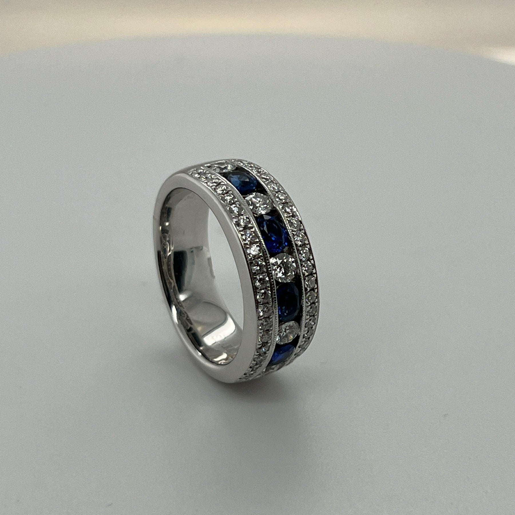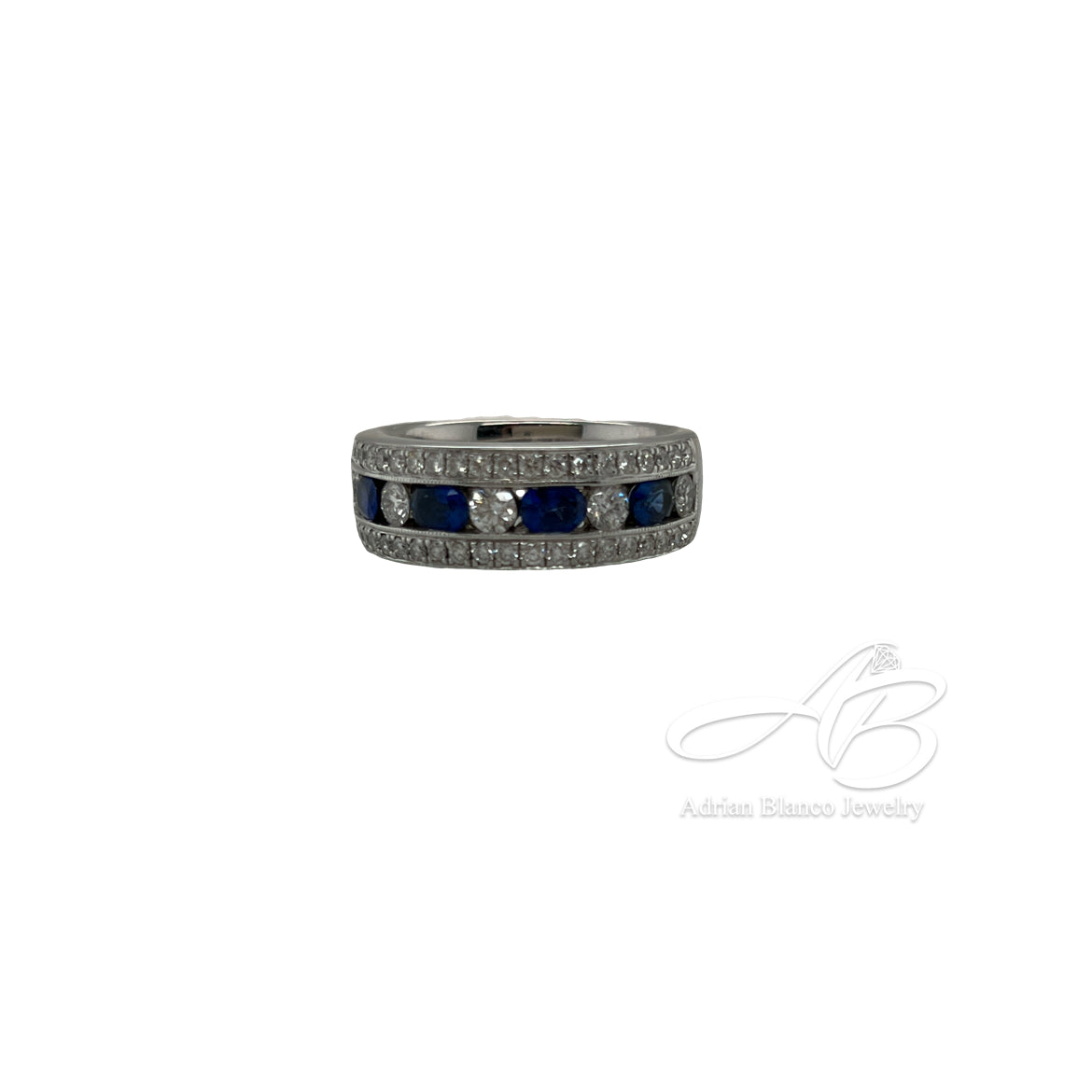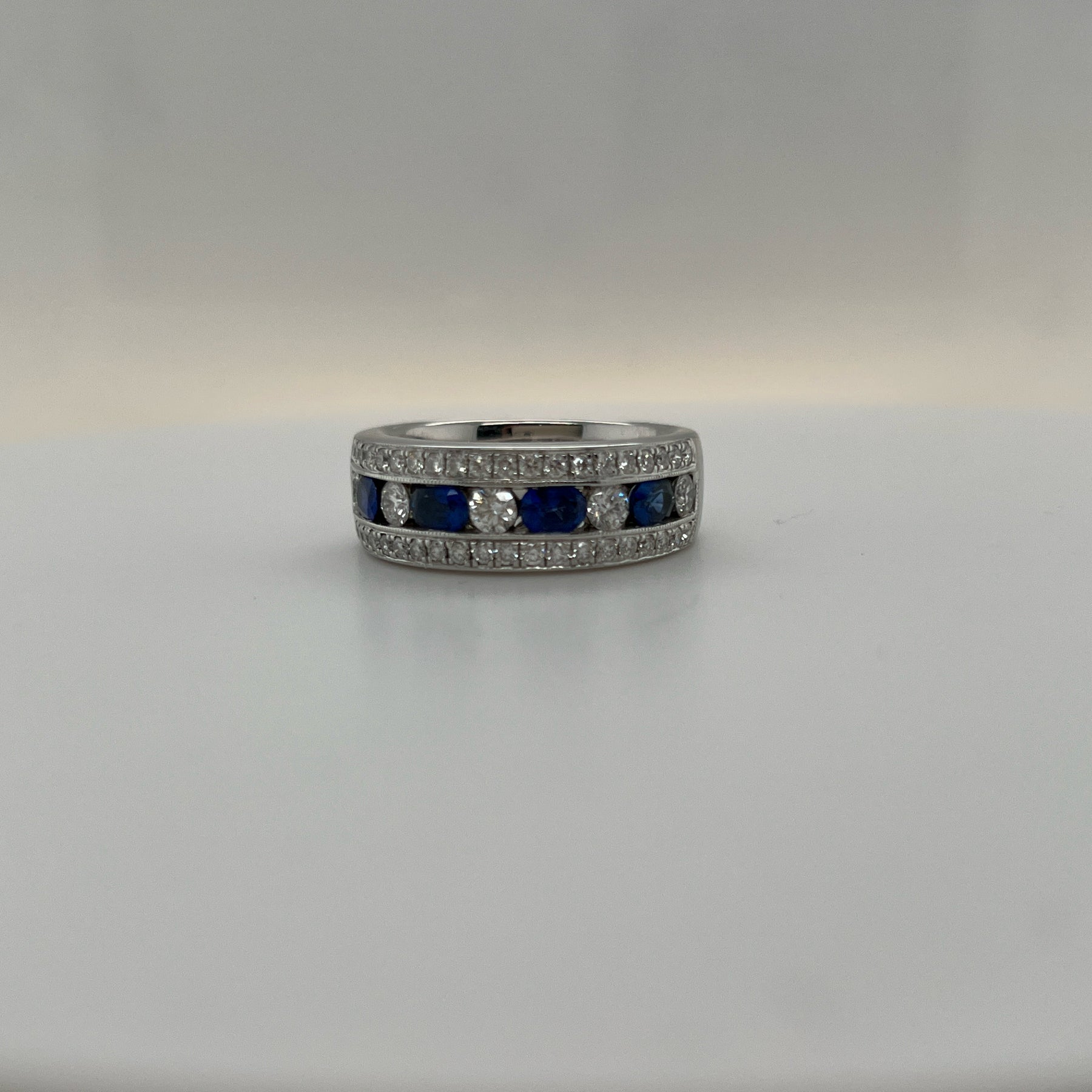 This one of a kind Platinum Diamond and Blue Sapphire fashion ring will complement any special occasion or anniversary. The ring holds twenty six round accent diamonds and thirty princess cut blue sapphires with the star of the show at 5.7mm, which is slightly less than 3/4th carat. Our total weight of the stones are 2.05ct. Our current finger size is 7 weighing 10.6 grams.